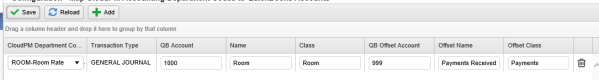 If you have never used this menu before, you must first map each department code you wish to track in QuickBooks on the upper half of the menu. Click the Add button to add a new row, then fill in each column. The first drop-down will use the Chorum department code, while the remaining columns (QB Account, Name, Class, etc) refer to the account data you have set in QuickBooks.